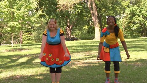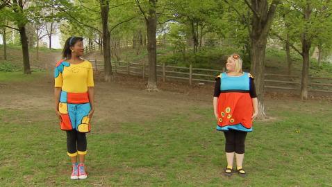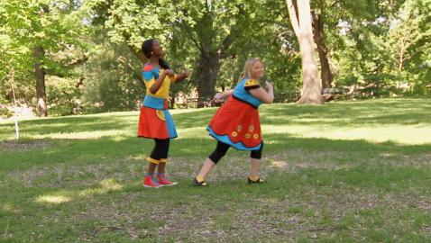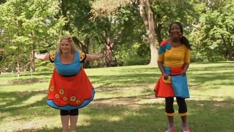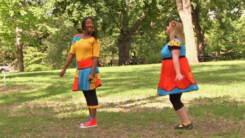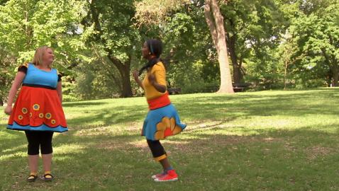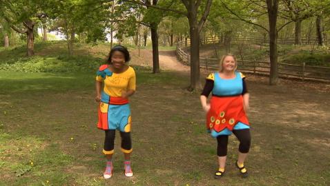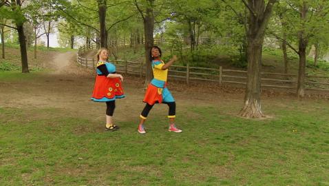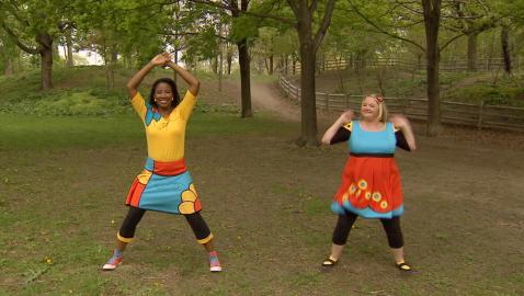Lexie et Josée s’amusent en bougeant dans le parc. Elles courent, sautent et bougent rapidement, lentement, en faisant des grands gestes ou des petits gestes et invitent les enfants à en faire autant.