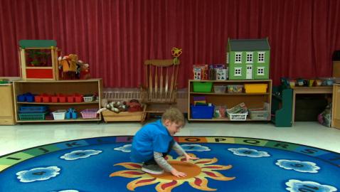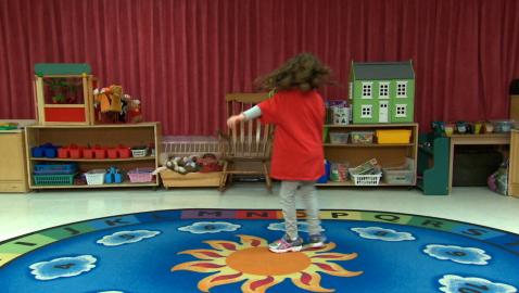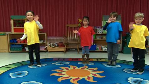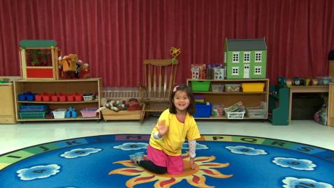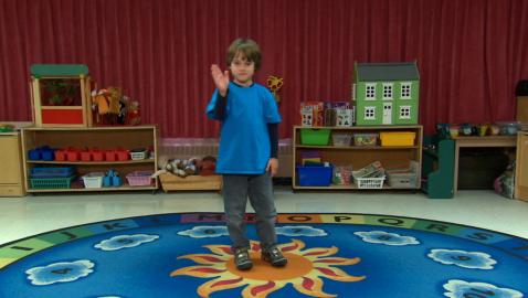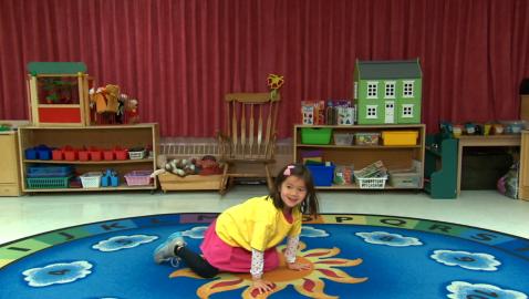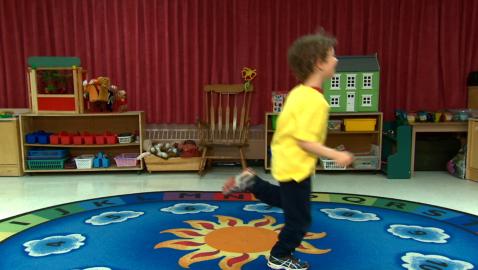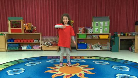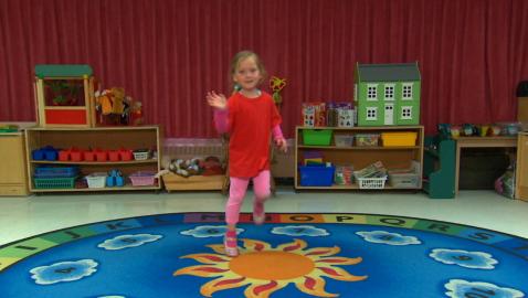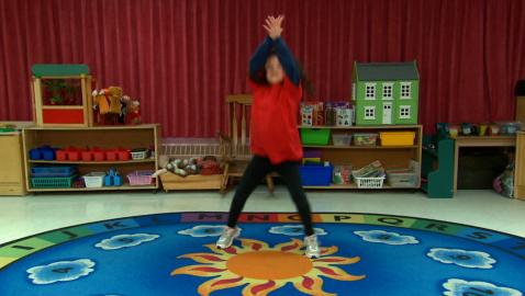 Jeu de devinettes où les enfants doivent identifier et compléter la suite «sauter comme une grenouille, sauter en étoile et sauter sur un pied».