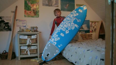 Anselme lives in Brittany, in France, near the sea. His room brings together everything he likes, especially his surfboard!