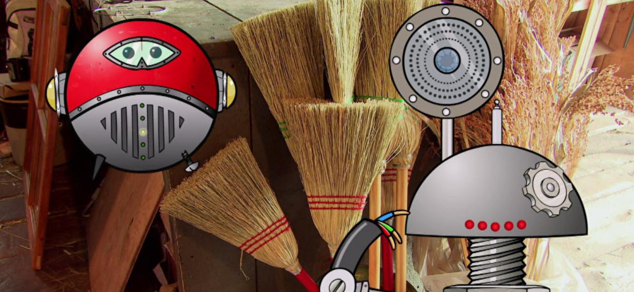 Pat et Bibi découvrent comment on attache solidement la paille au manche d'un balai pour qu'elle ne s'envole pas.