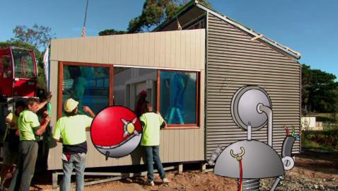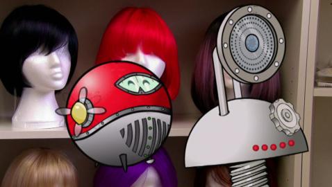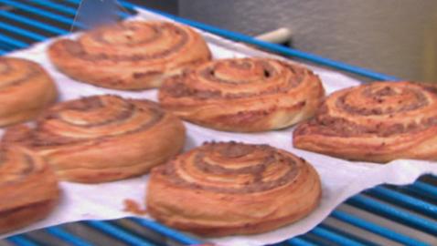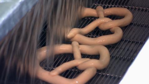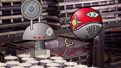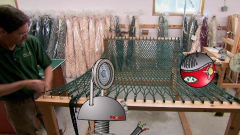 Grâce à une lame géante qui pèle les troncs d'arbre, Pat et Bibi découvrent comment on obtient les feuilles de bois que l'on colle ensemble pour faire du contreplaqué.