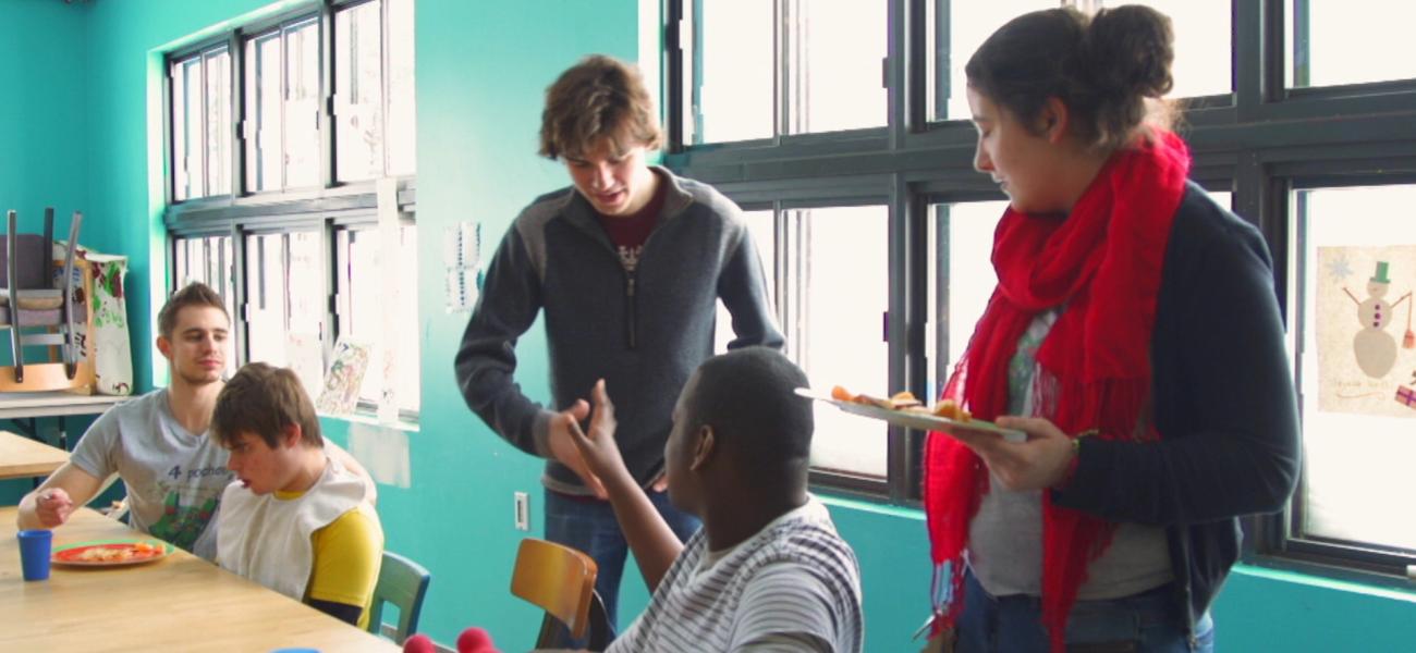 Raphaël est à Boucherville, une banlieue de Montréal. Il vient à la rencontre de deux filles très généreuses et dévouées. Elles travaillent dans un centre qui accueille des enfants handicapés pour donner un peu de répit aux parents. Le centre Aux Quatre Poches est réellement au service des enfants qui ont des besoins spéciaux mais qui répond également aux besoins des parents. C'est donc un organisme essentiel pour les parents!