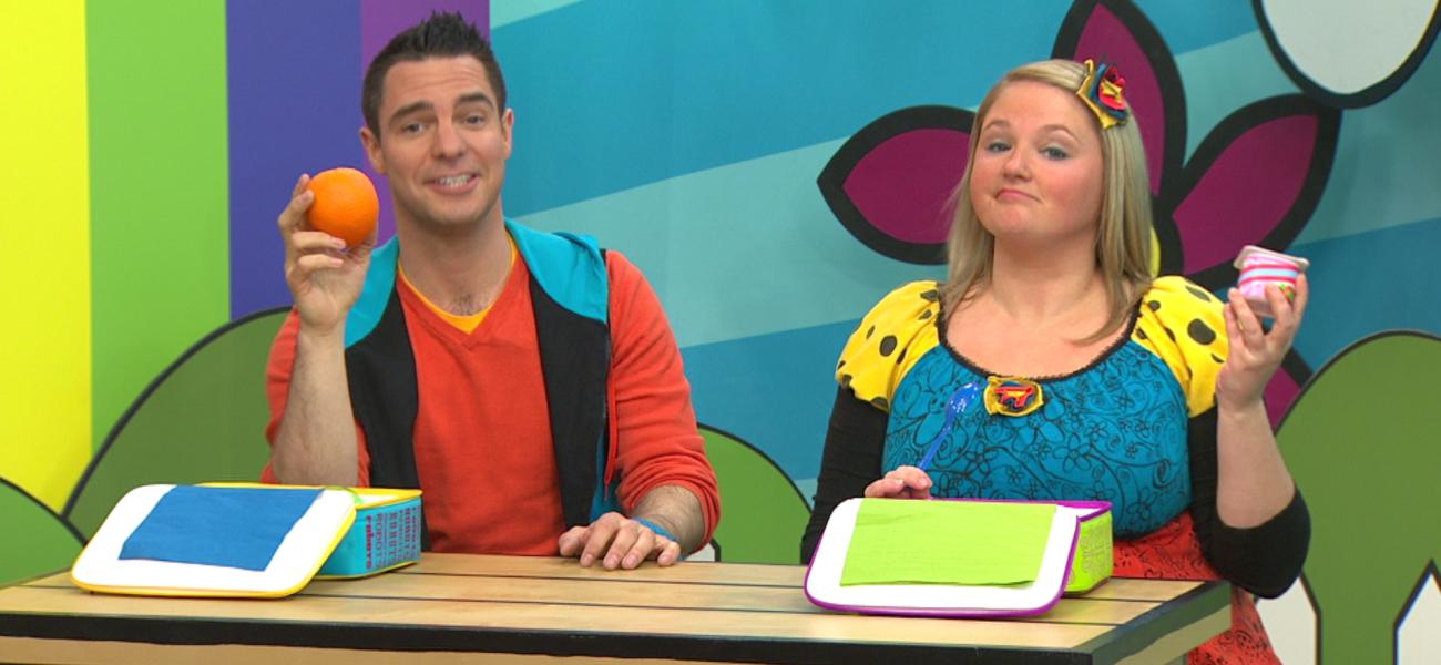 Louis et Josée découvrent des collations santé. Ils découvrent une orange et un yaourt aux fruits dans leurs boîtes à goûter.